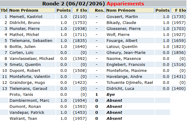 Open Hiver 2026 : Appariements de la ronde 2