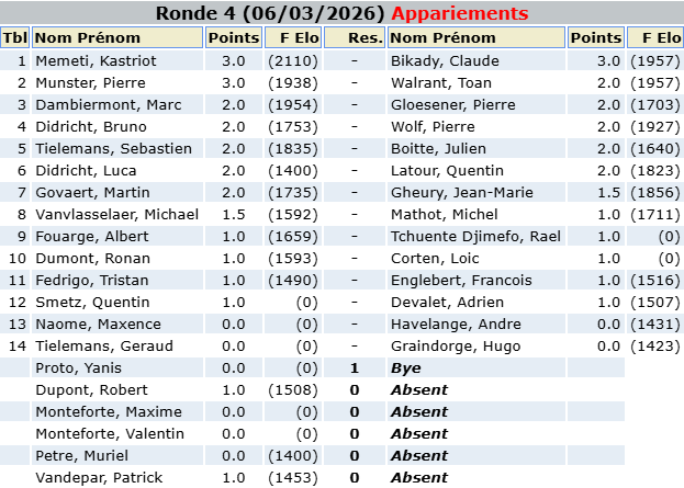 Open Hiver 2026 : Appariements de la ronde 4