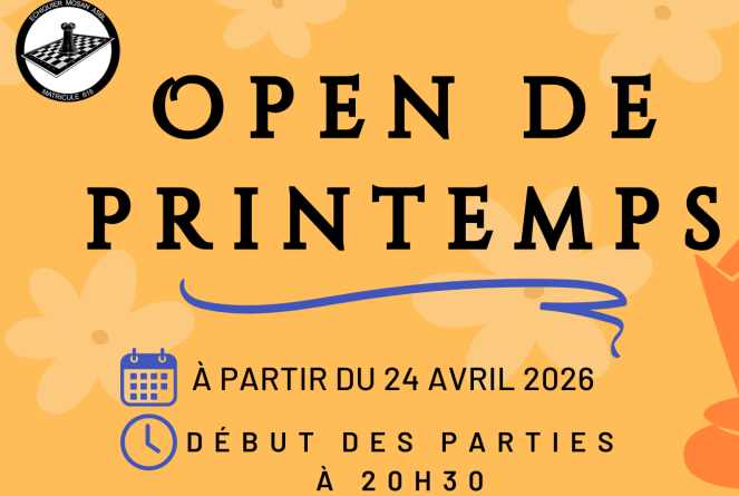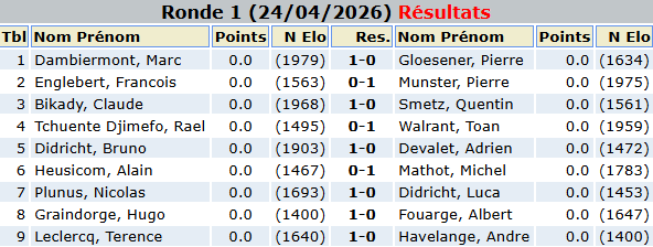 Le vendredi 24/04/2026 s’est déroulée la ronde 1 du tournoi Open Printemps 2026 du Royal Échiquier Mosan.